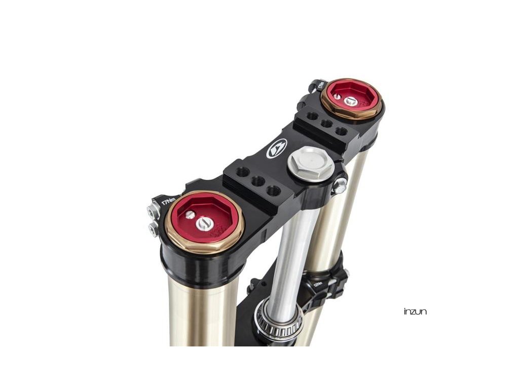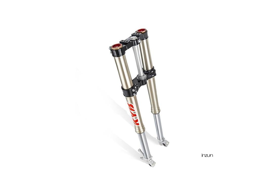 Uzavřená kazetová vidlice Kayaba AOS o průměru 48 mm: eloxované vnitřní díly a úpravy materiálů minimalizují kluzné tření, zatímco nastavitelná komprese a tlumení odskoku umožňují každému jezdci najít perfektní nastavení.
