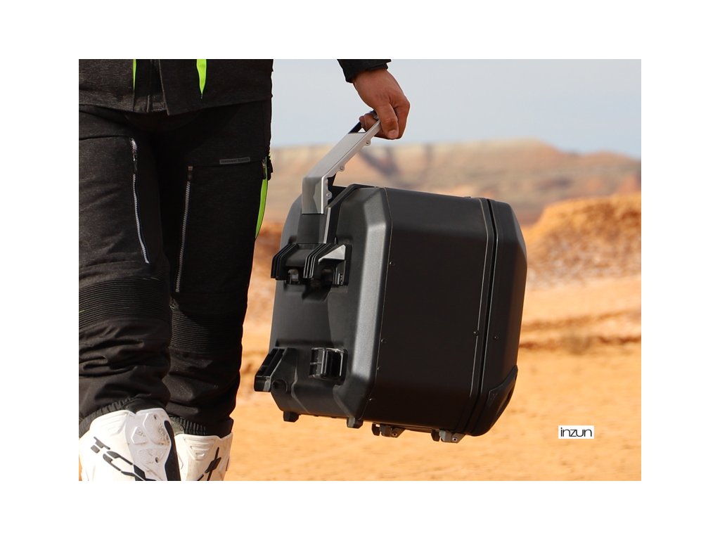 Unikátní integrovaný mechanismus zámku a madla umožňuje jednoduché ovládání jednou rukou a snadnou demontáž z motocyklu.