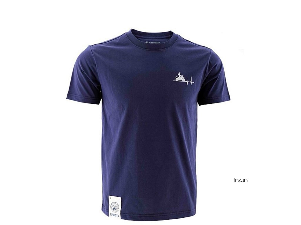 Modré tričko CFMOTO s piktogramem motorkáře vpředu a grafikou "Go With The Flow" na zádech.