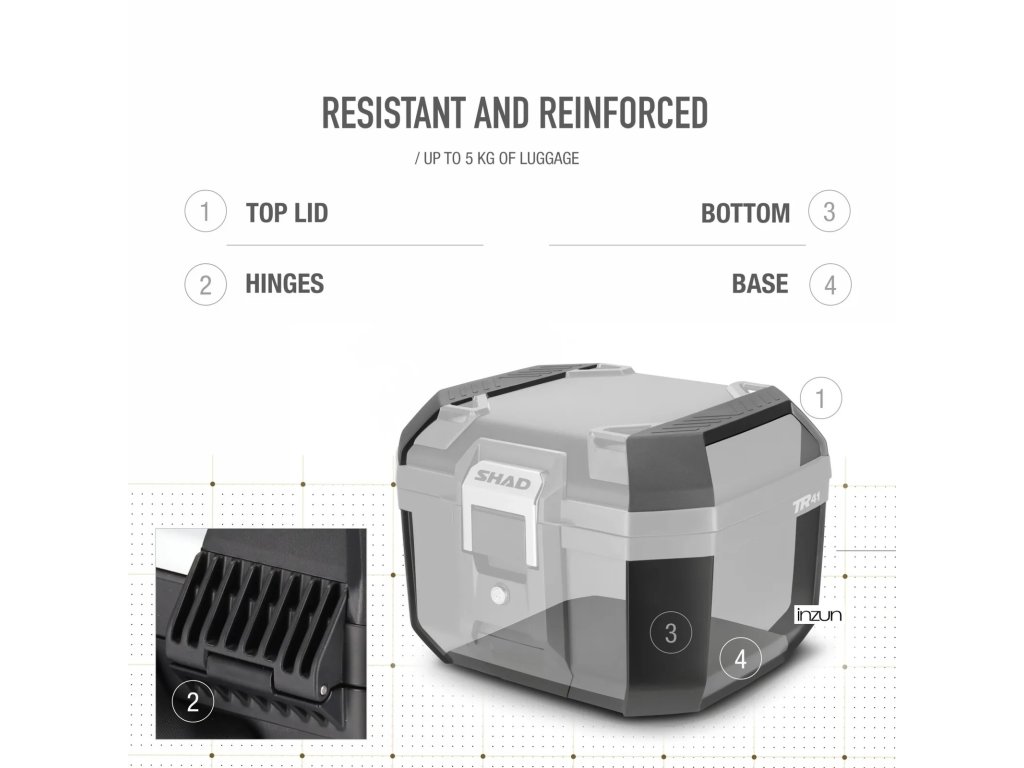 Topcase TERRA TR41 pojme dvě otevřené přilby typu JET nebo náklad do 5 kg. Je vyroben z vyztuženého polypropylenu, který zajišťuje vysokou odolnost při minimální hmotnosti. Plně navržen v Barceloně, má konstrukci vytvořenou pro maximální odolnost i v náročných podmínkách. Těsnící rám chrání obsah proti dešti a prachu. Nahoře najdete háčky pro připevnění dalšího nákladu a robustní nerezový zámek pro maximální bezpečnost. TR41 je všestranný kufr vhodný pro silniční i terénní použití.